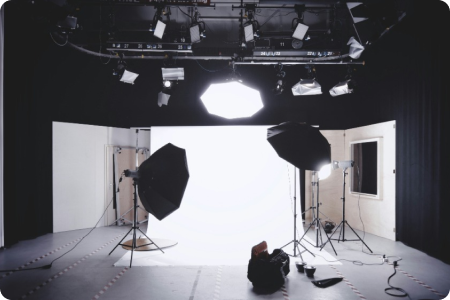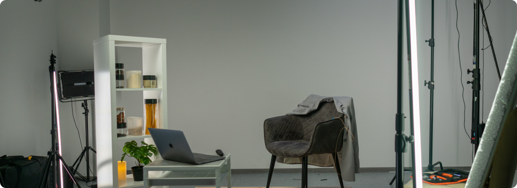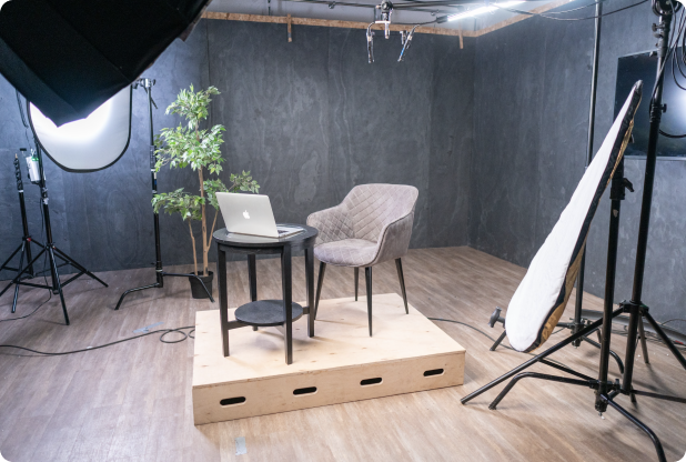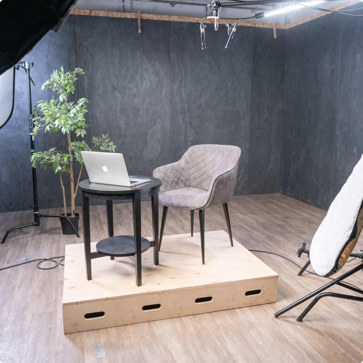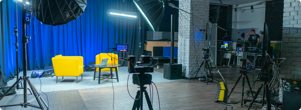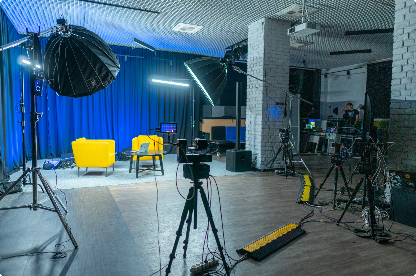 Подходит для интервью — студия с дизайнерским интерьером и комплектом мебели, доступны различные цвета фона и градиенты. Съёмка включает настройку 2-4 камер и работу операторов, звукозапись и видеозапись. Также доступна запись с экрана компьютера. Готовый материал переносится и структурируется в исходном качестве и готовится к монтажу (включая создание proxy-файлов и файлов синхронизации материалов).