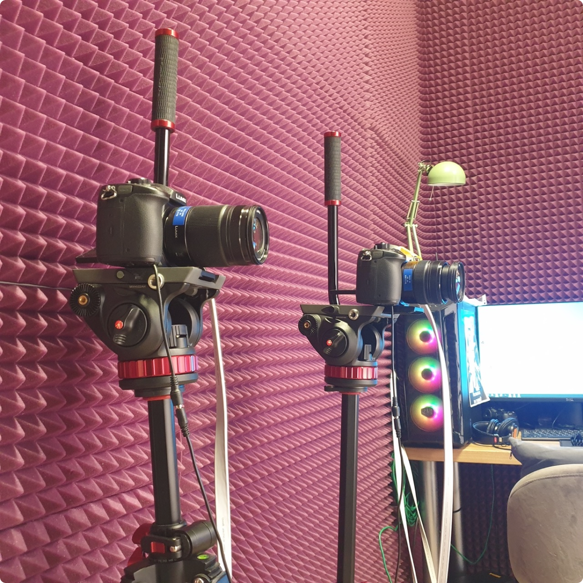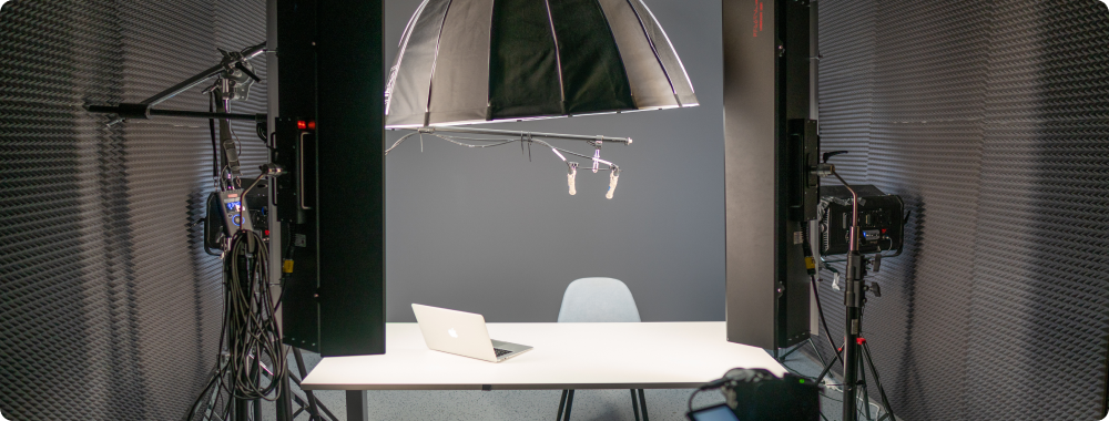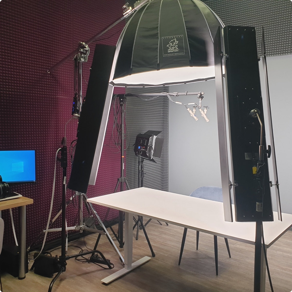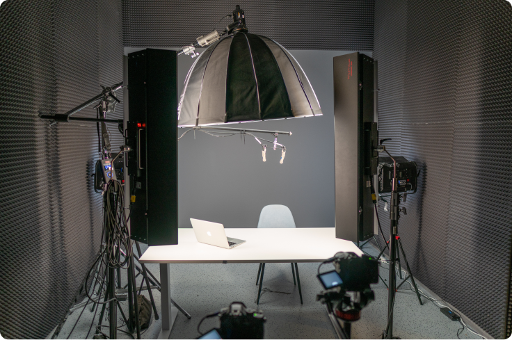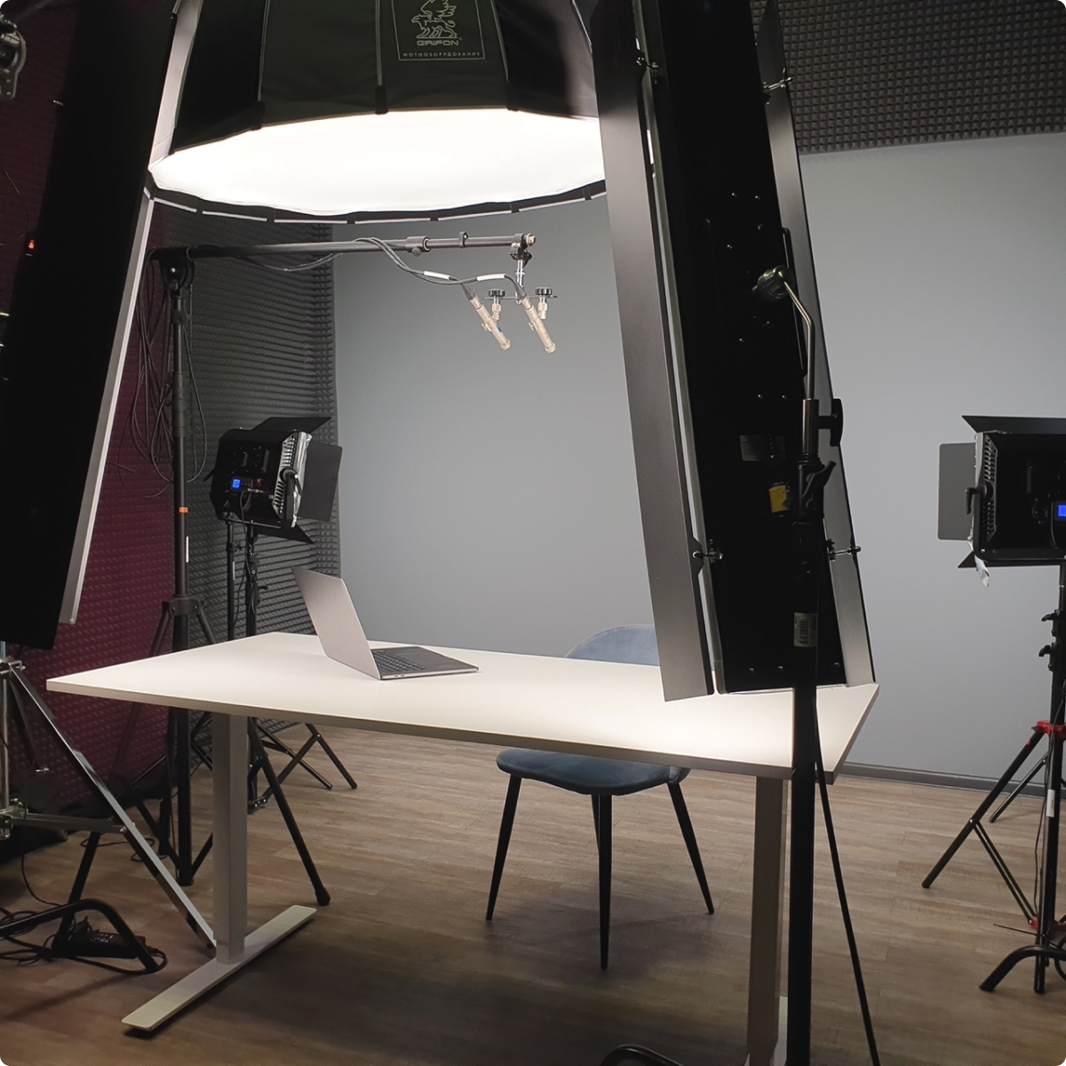 Подходит для двух спикеров в кадре на различных фонах (также доступны градиенты). Съёмка включает настройку 2-3 камер и работу оператора, звукозапись и видеозапись. Также доступна запись экрана с компьютера, съёмка стола сверху, тестовая запись. Готовый материал переносится и структурируется в исходном качестве и готовится к монтажу (включая создание proxy-файлов и файлов синхронизации материалов).